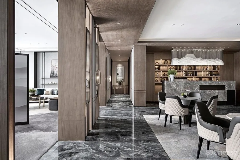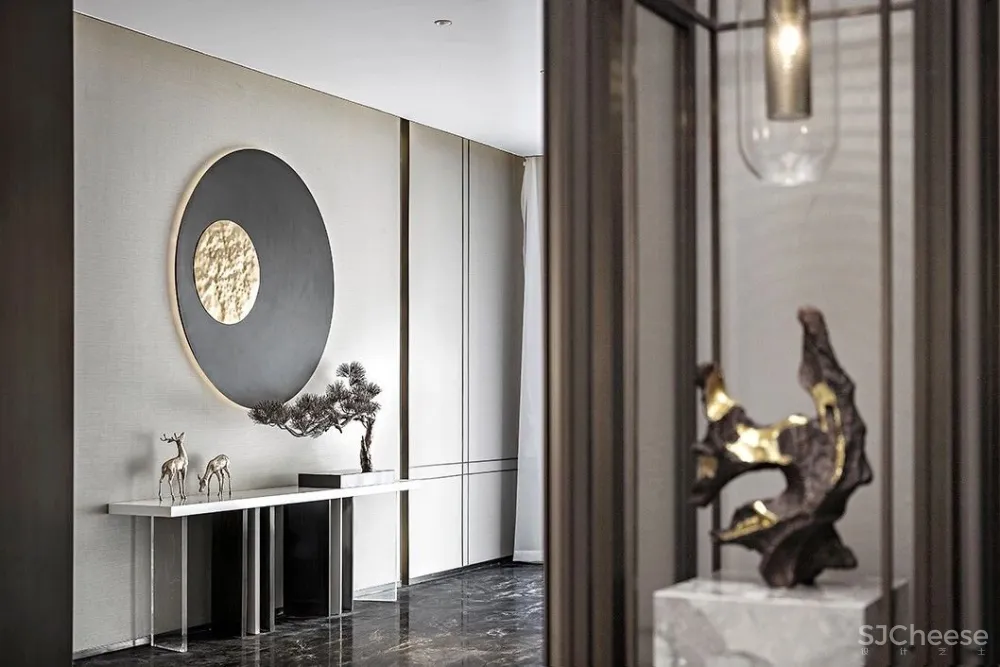 古有钧瓷,入窑一色,出窑万彩。设计师张怀、郑亮、周术荔通过平衡色彩,赋予项目生命,将金色的精致与奢华融进黑白灰的中式空间。