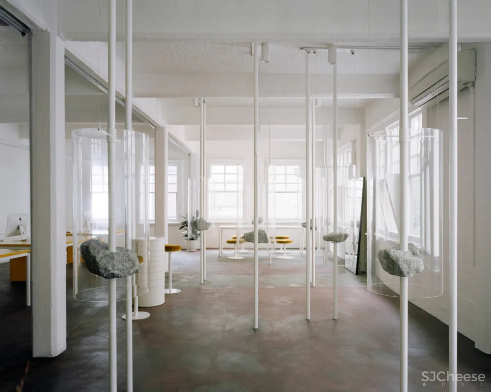 “漂浮”的大圆石陈列柜被安装在开放式展厅的一半,而另一半则被用于办公空间,明亮的黄色办公桌和被会议凳环绕的会议桌。通过放下悬挂在柱子之间的一系列淡黄色窗帘,办公室可以与展厅分隔开来。