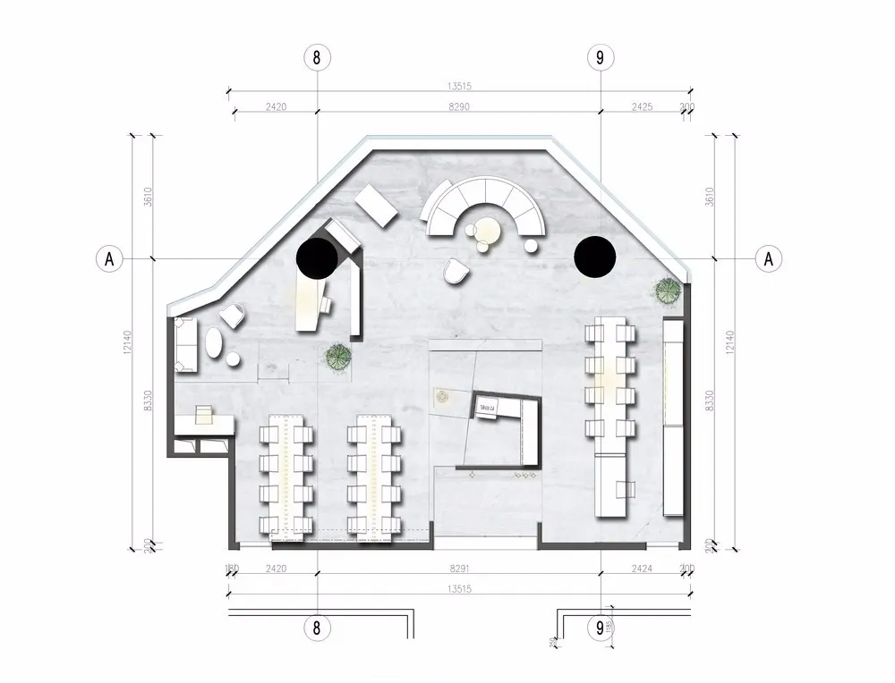 前台是一直延伸至餐桌的大体块,中间的隔板将两个区域巧妙划分,将空间的完整性、功能性发挥到极致。台面上配以充满趣味性的艺术品,理性与感性在此展现,让办公空间有序又不单调。
