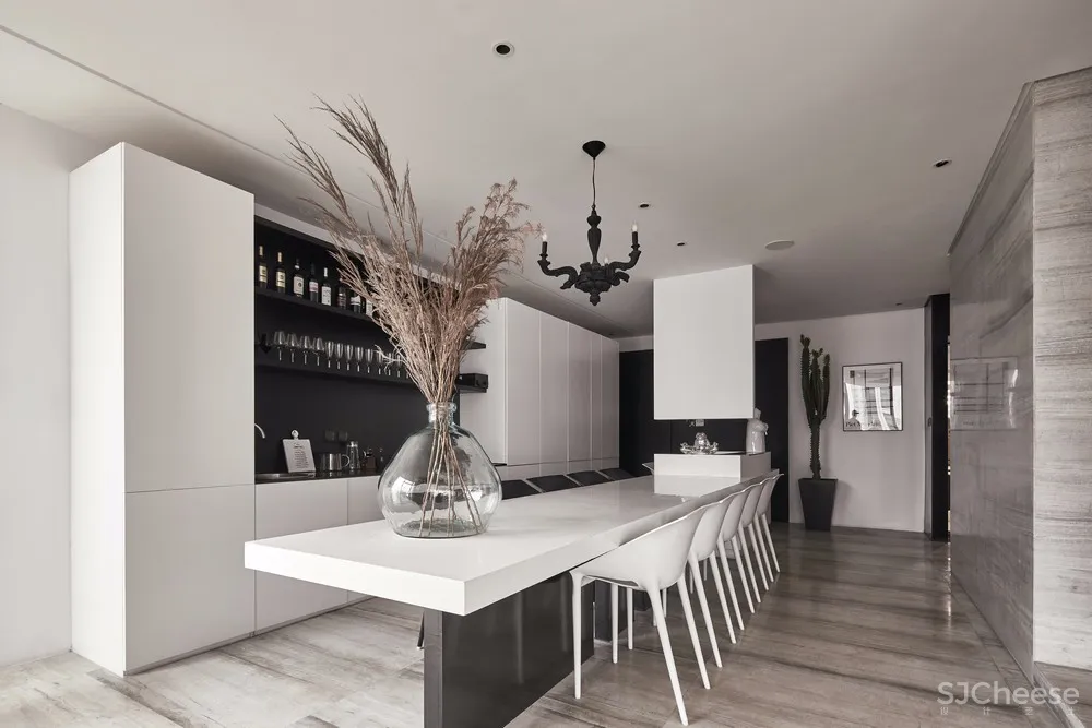 水吧区域中白色隐形柜门与黑色隔板形成鲜明的对比,让空间具有层次感。足够的储存空间可以容纳微波炉、冰箱以及厨具等生活用品。在这里冲调手工咖啡、品茶、饮酒、开展活动集多功能于一体。
