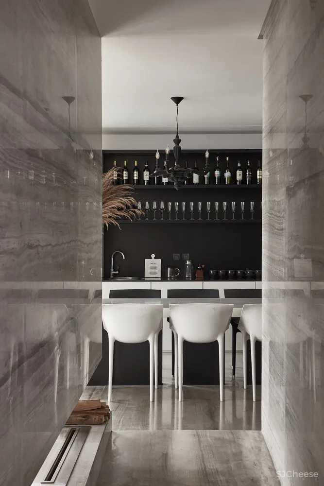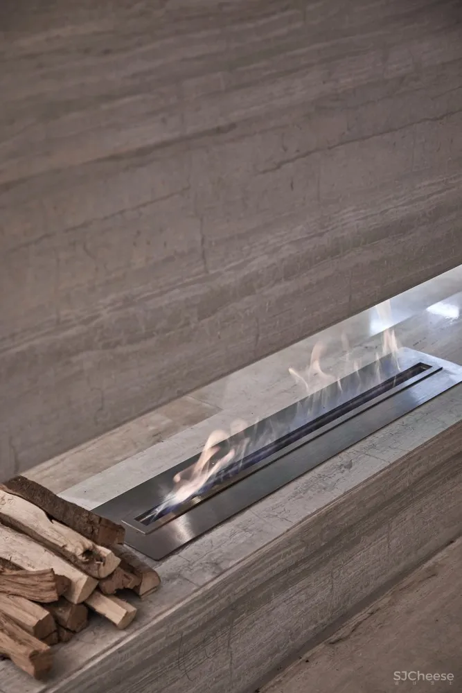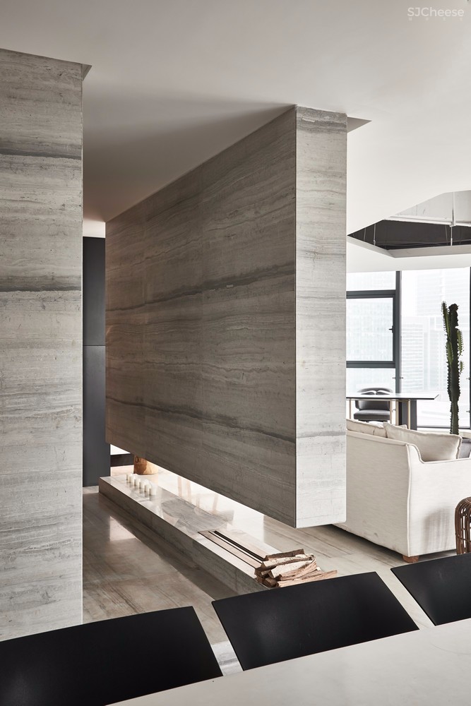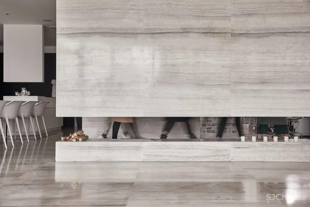 从水吧区到大厅间穿插了一个“隧道”,大理石材质的体块底端配以悬挂式壁炉,作为一个重要的通道连接着空间的各个区域。走在其中,虚实之间,形成丰富又连续的空间秩序。
