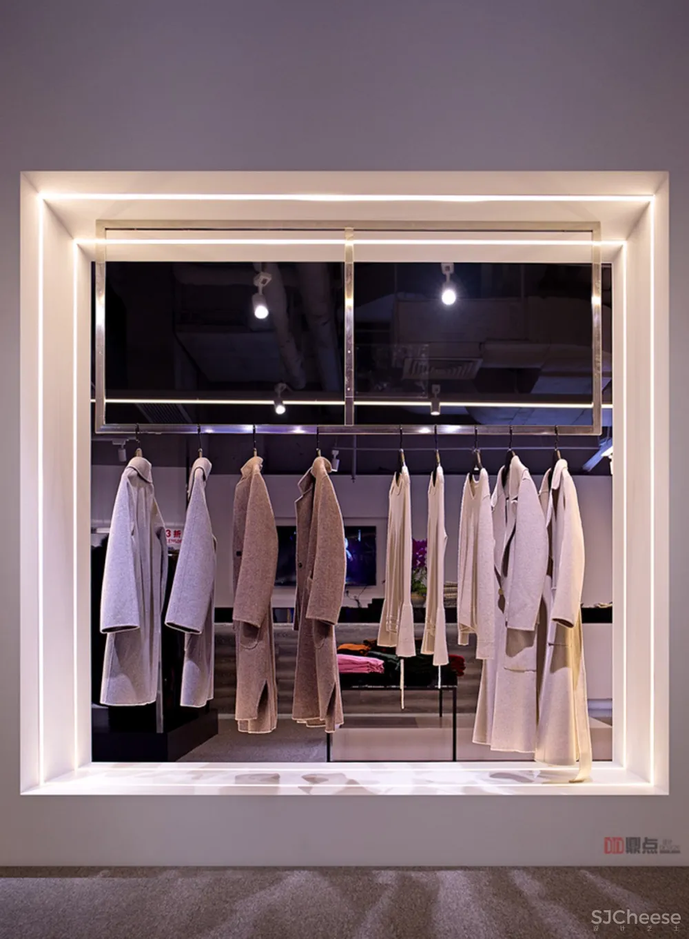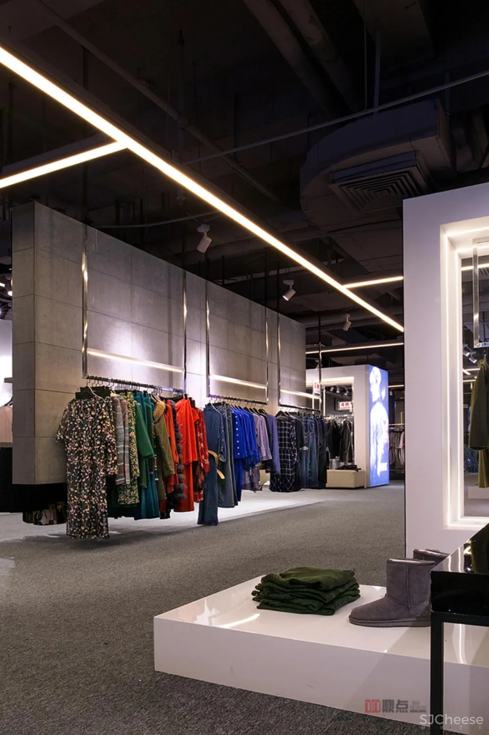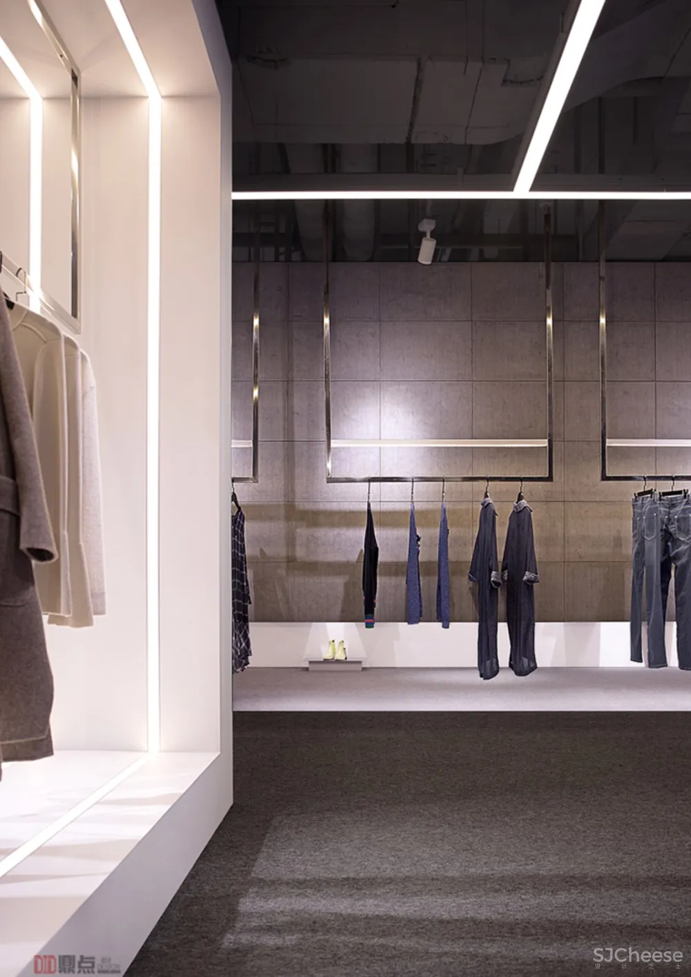 设计时,从奥特莱斯品牌本身入手,对其剖析与理解后,凸显品牌简利落、时尚的特点。 奥特莱斯属于时尚品牌折扣店,在销售模式上倾向于快捷,简便,在设计时提炼出品牌服装风格再结合这一特点,用简练,利索的线条作为主要设计元素,从“线条”延伸出各种“点”和“面”,再让“点线面”三者融合,形成层次丰富多样的空间,引发人们对未知进行探索的渴望。 In design, we start with the brand OUTLETS itself, analyze and understand it, and highlight the characteristics of simple and fashionable brand. OUTLETS belongs to fashion brand discount store. It tends to be fast and simple in sales mode. When designing, it refines brand clothing style and combines this feature. With concise and sharp lines as the main design elements, it extends all kinds of points and noodles from lines, and then integrates points, lines and surfaces to form a rich and diverse space, which causes people to fail. Know the desire to explore. 项目名称:OUTLETS 奥特莱斯服装店 地 点:广西桂林 设计单位:DID鼎点室内设计(深圳) 设计主创:罗淞元、程施洋 设计团队:徐镇涛、张俊峰、黄思琪、 设计时间:2018年11月 项目面积:370平方 主要材料:不锈钢、白色烤漆板、水泥装饰板、条型LED灯 摄 影 师:ALON LUO