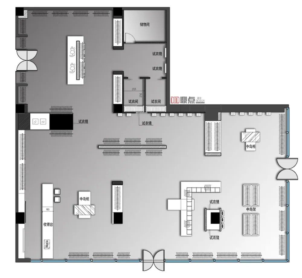 ▼ 试衣间 试衣间使用了木饰面来进行空间的柔化,缓解了空间不锈钢,烤漆板等材料带来的空间过于“硬朗”的感觉。