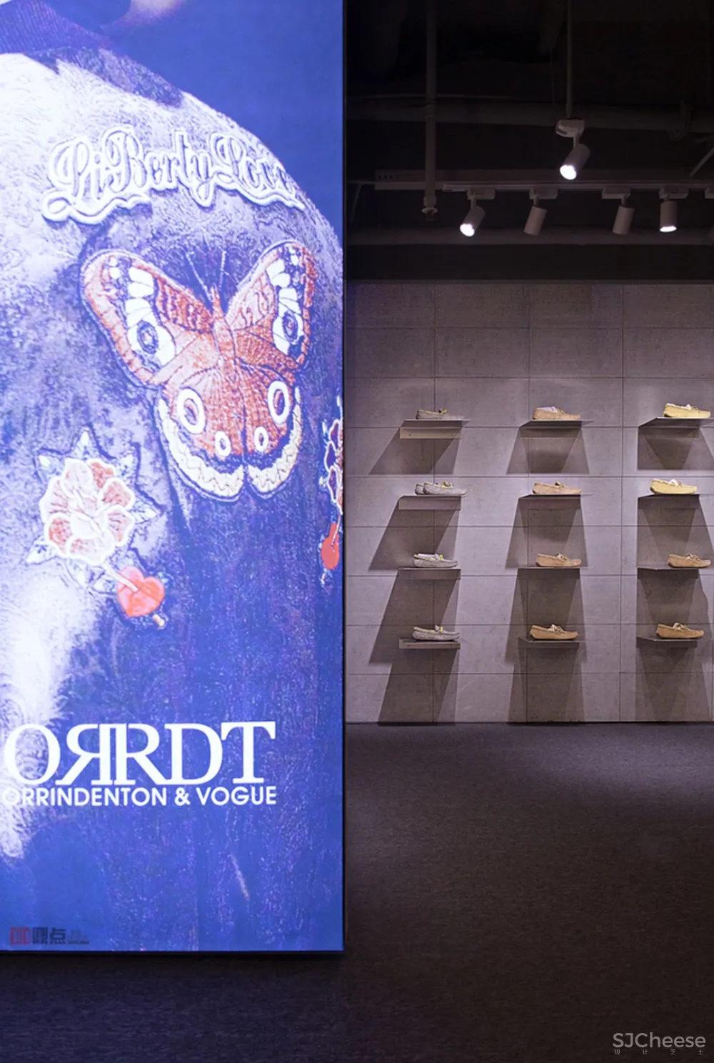 空间上,灯具,展示架,展柜外形等等都充满“线”元素,再结合展鞋架的“点”,墙面大块瓷砖、地面大块地毯的“面”,“点线面”的应用,给空间带来轻便的时尚感。