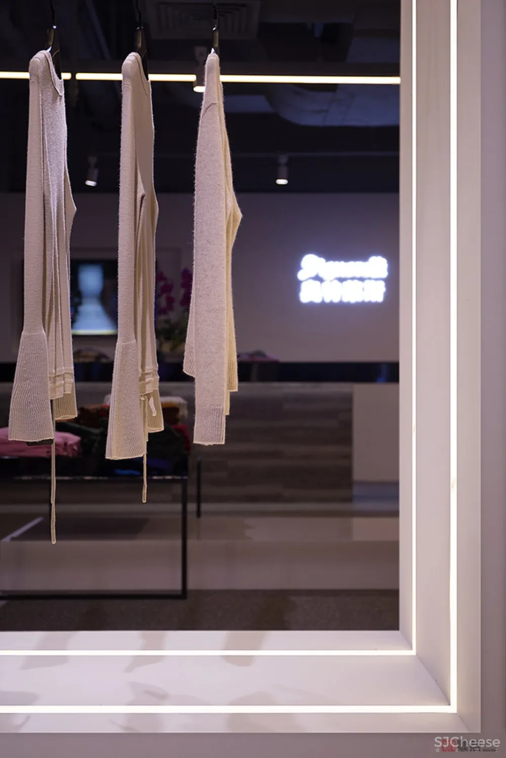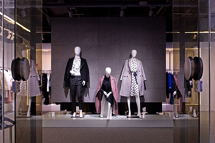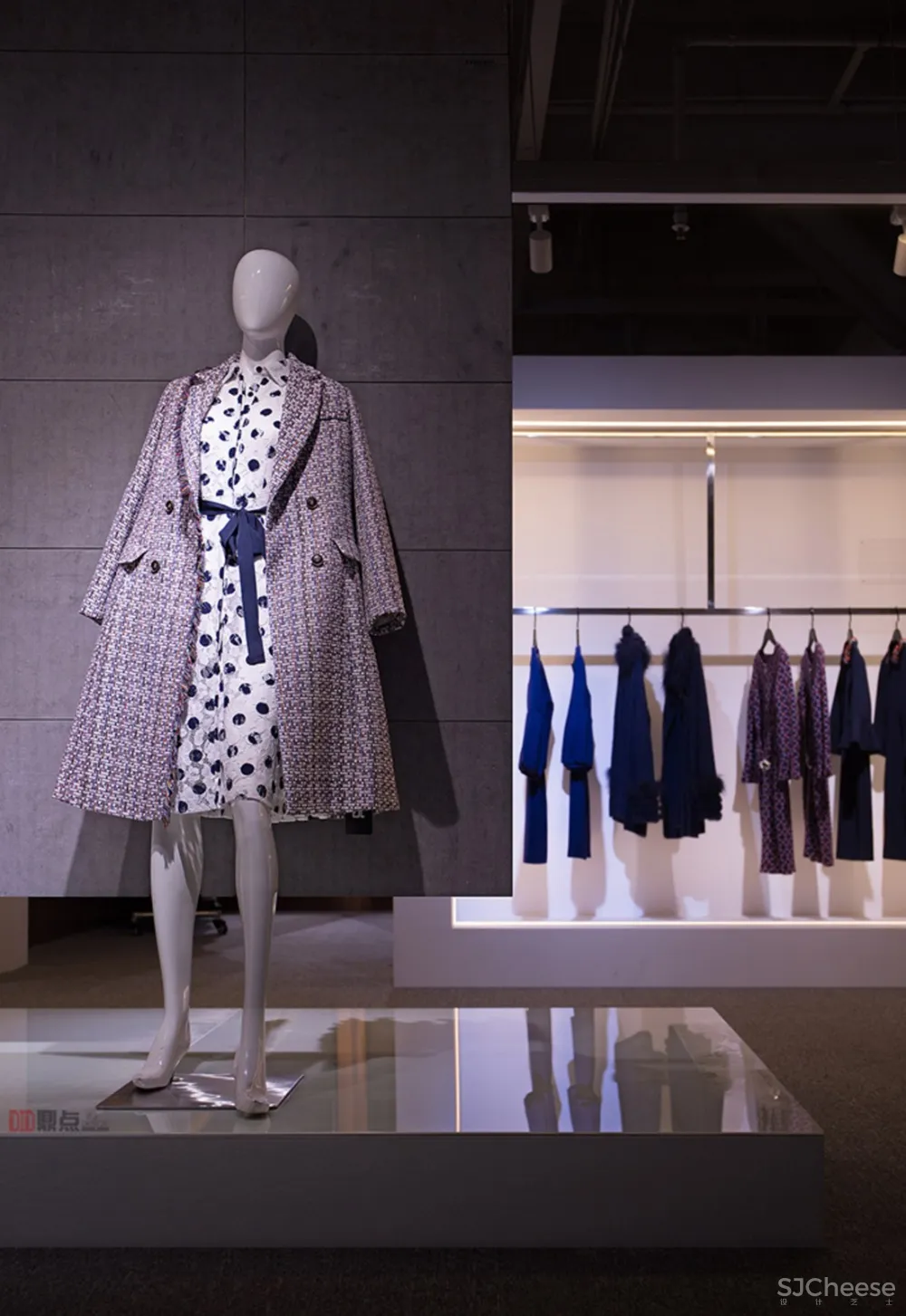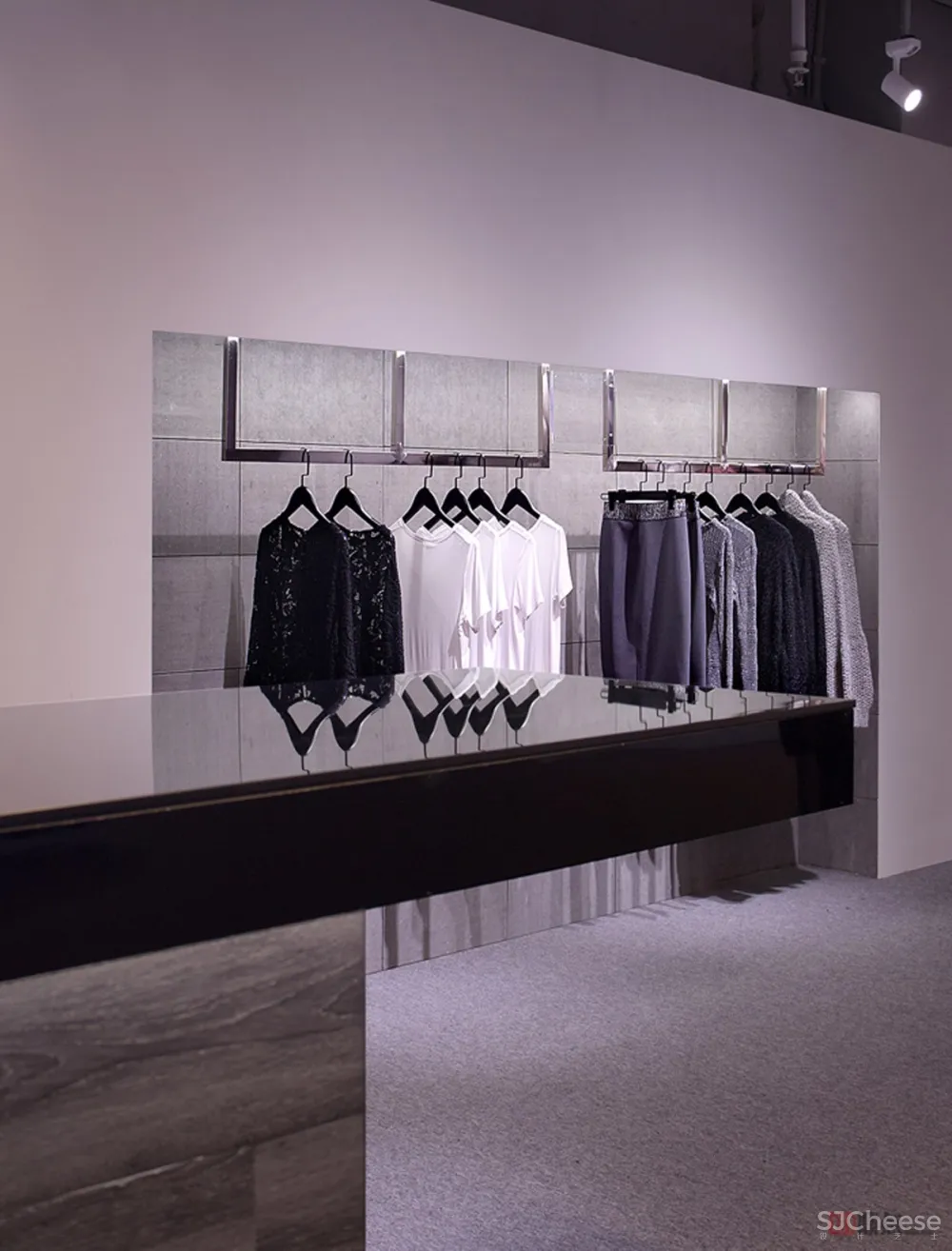 ▼ 入口模特展示台 地台采用烤漆板饰面,墙面下吊不到底,采用水泥装饰板饰面,材质间的对比性之强烈,让看台的热款成为视线焦点。