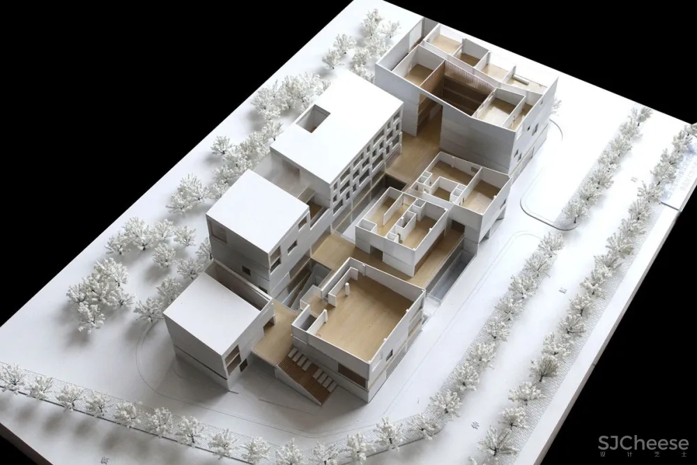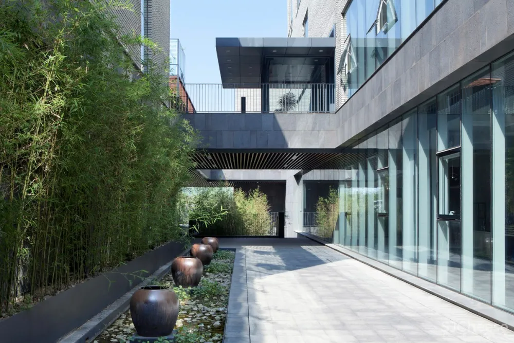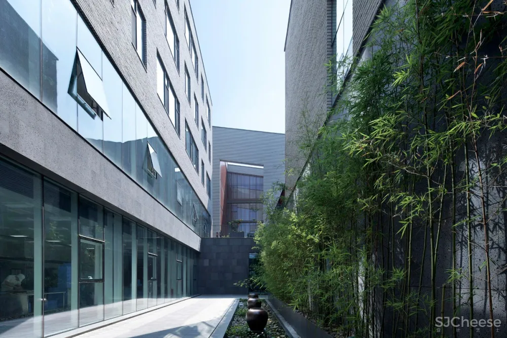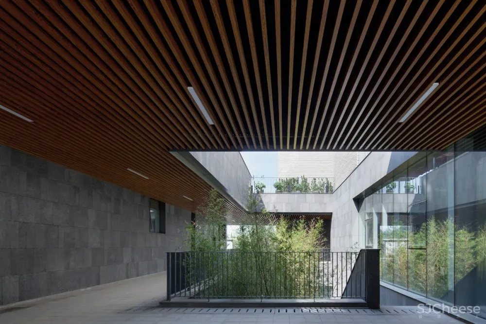 在空间归类的基础上,设计详细考虑了建筑各部分功能的空间关系,这其中相对独立又各自联系的空间内容让人联想到中国民居聚落的空间组织方式——看似各自独立的建筑以一种巧妙的方式相互联系着,形成一个建筑的集群。这与我们最初希望这个建筑在整个区域中呈现的气质是非常接近的,我们将聚落空间的组织方式引入到这个建筑中,将各功能空间依据使用需求化整为零形成宜人的小尺度建筑,并将这些建筑以一种看似自发的方式组织在一起。这些小体量的建筑在这种自然的空间组织中形成了很多微妙的变化,庭院、街道、露台、廊桥……这些丰富的空间元素将一种生活场景感带入到了这个建筑中,为这个企业建筑营造出了多样的空间小环境。