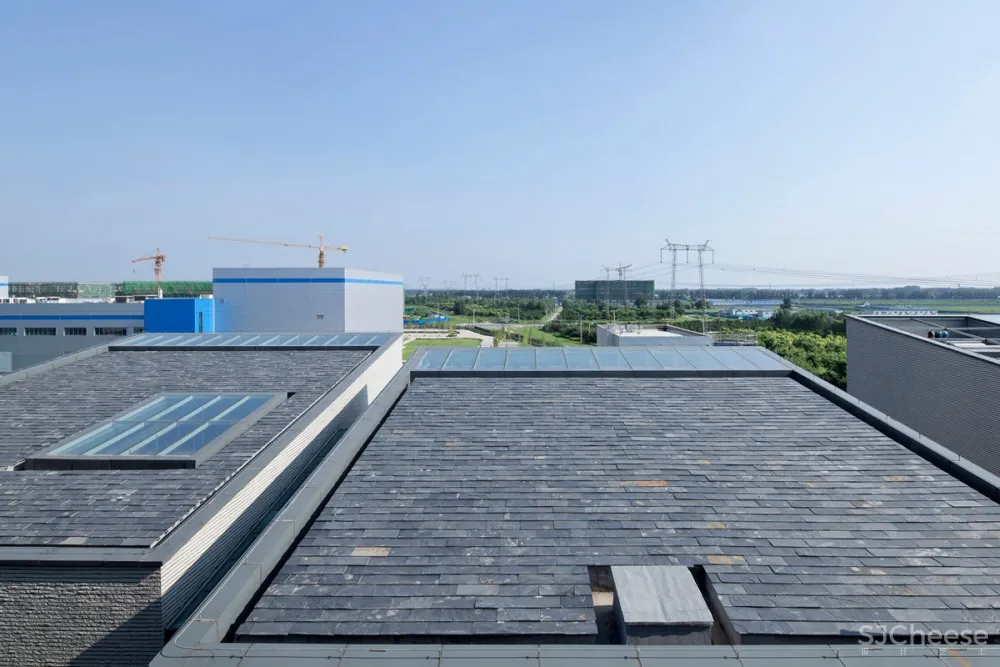 北京东方阳阳企业是国内民营的餐饮企业,企业文化带着深厚的“东方情节”。这样的企业在一个新兴工业园区中营造自己的生产办公建筑,如何让建筑以一种适当的方式呈现在所处的环境中,同时体现企业建筑自身的特色是这个设计过程中反复思考的问题。面对周围空旷而具有工业感的环境,我们感到这个有着“东方情节”的企业建筑不应该简单的介入这片场地,它需要有一些坚守,带着一点点的抵抗性;同时,我们也希望这个建筑中的些许不同,能够在这个区域唤起一定的人文感怀——在当下大量新兴产业园区的快速建设中,是否也可以去守望一份属于自身的文化内涵。