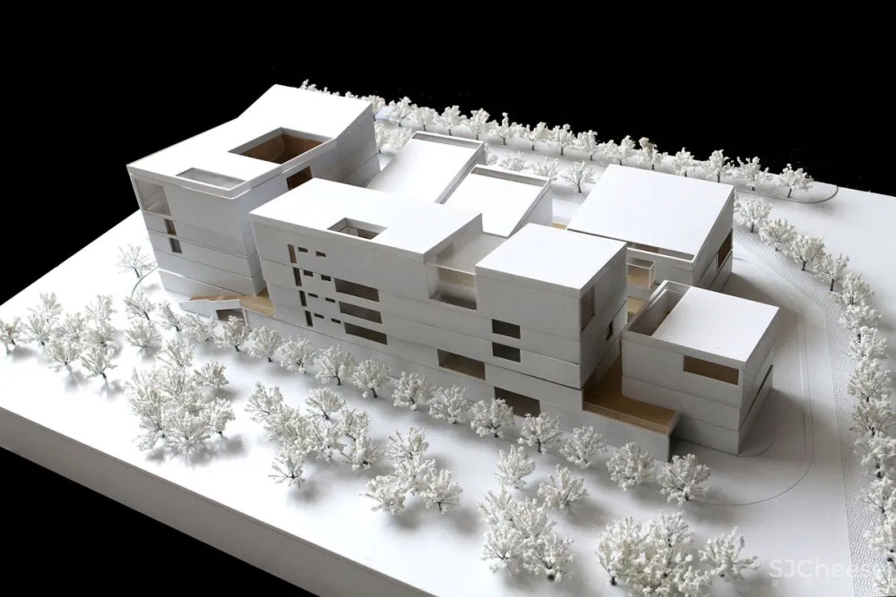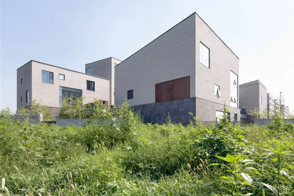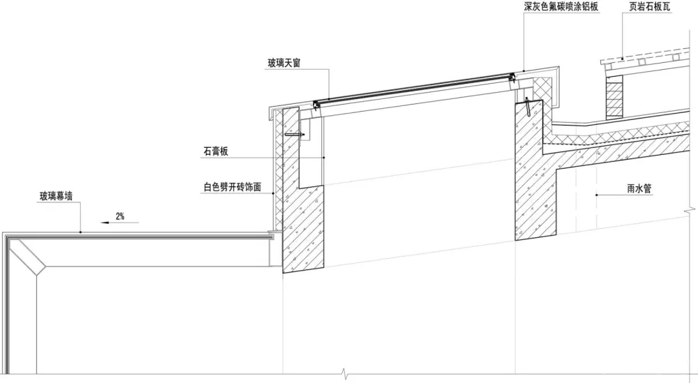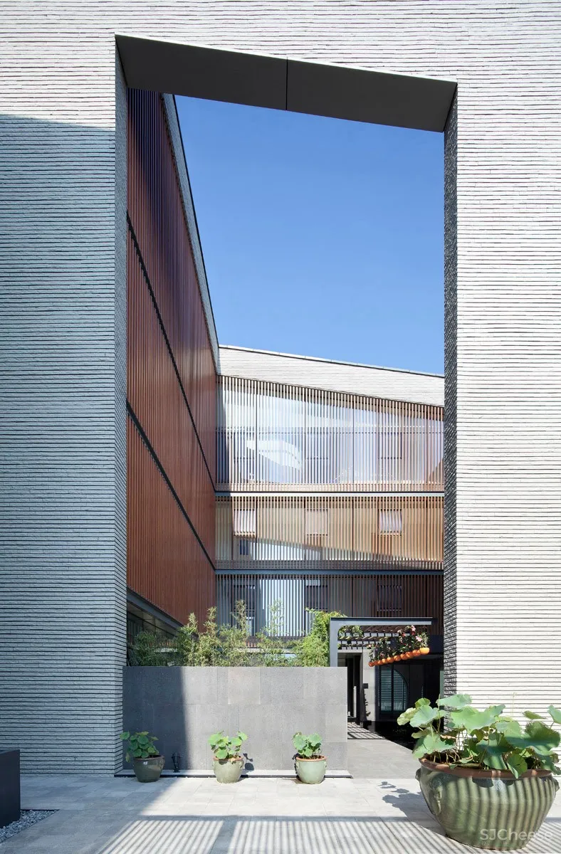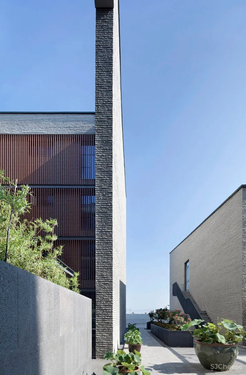 为了体现建筑的人文气息,这个建筑整体上以灰白色的基调来呈现。由于建筑在首层和二层以上的部分在空间内容上进行了界定,因此在建筑材料的使用上,设计也对这两个部分进行了区分。建筑的首层采用了深灰色的黑洞石,黑洞石的表面通过不同程度的抛光次数来体现不同的明度效果,并通过现代性的错缝拼接方式呈现在建筑的表面;二层以上的部分采用了白色的劈开砖,劈开砖在拼接的过程中刻意将横缝加大,而竖缝减到最小,这样的处理使得整个建筑在阳光的照射下呈现出很强的水平向伸展感。屋面的设计中,坡屋面采用了简化的处理方式,各部分屋面的坡向向着中央的庭院展开。屋面的材料没有采用传统的瓦屋面,而是通过架空层的方式铺设了深灰色的青石板,青石板的完成面与屋顶女儿墙檐口保持一致,使这些错落的屋顶展现出与传统屋面不同的现代性。