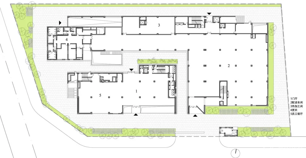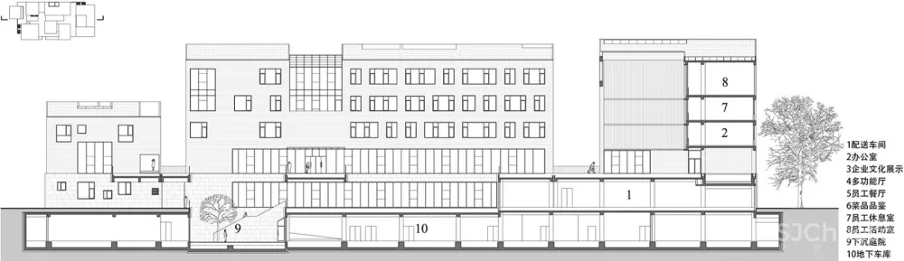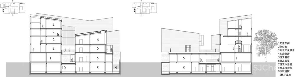 在这样的思考下,建筑如何去回应这样的想法是设计着重解决的问题。同时,现实的功能与流程亦影响着这个建筑介入场地的方式。这个以生产加工为主的企业建筑包含了多种附属的功能——加工、展示、企业办公、以及员工休憩空间等内容都集中在这个用地紧张、面积有限的建筑中,这些复杂的功能为建筑的空间组织带来了限制。