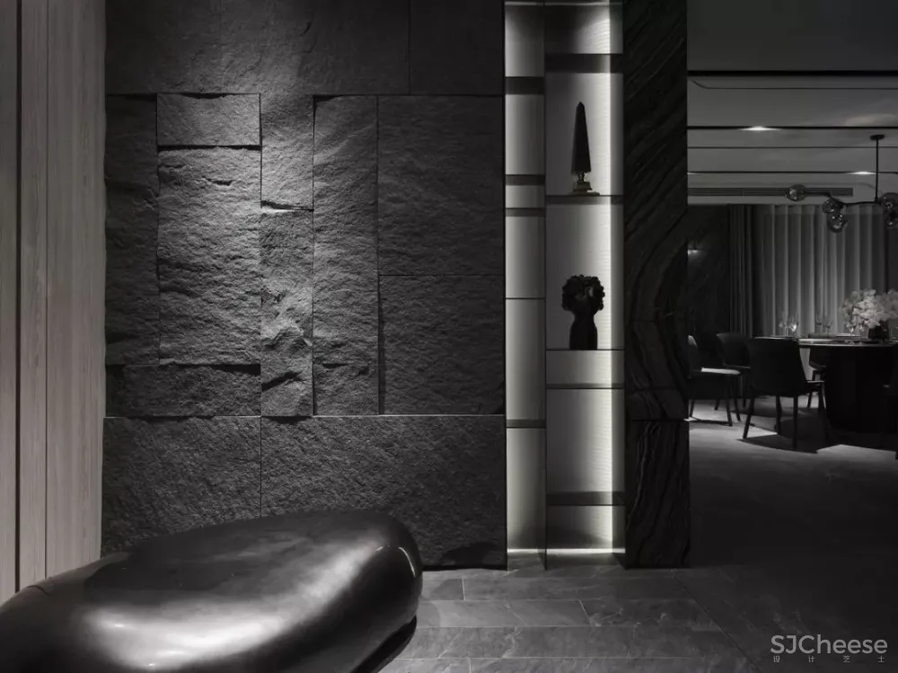 拉长4.5米的玄关,左右嵌入隐藏式鞋柜,主端景墙是拼贴的粗糙天然石皮,搭衬灰色板岩的地板材。 意大利imperfetto石头造型座椅低伏于前,展示柜与天花佐以明灯暗影,为空间领前铺述了一种沉潜低语。 而至转向客餐厅大开面窗景的明亮光感,由短碍口进入大开阔之湾的对比的暗伏手法,亦呈现在材质运用上。
