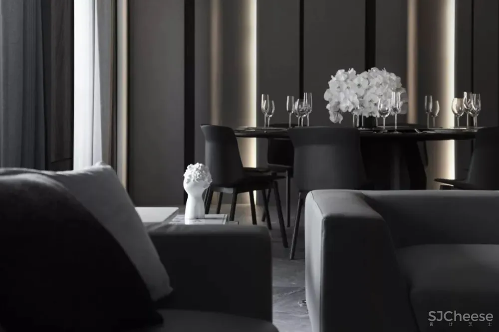 低彩度与自然材质的选用:大理石、木材、灰镜、铁件等等,在空间水平垂直线上,都经过特别铺排后的展现。 当走过一整排用不同石材迭衬起来的廊道,又转过一个柜体,会感受到看似材质所堆砌起来的空间感,皆必然源自于设计上精准比例的拿捏。 于是,一室有敞开、幽谧与转折,空间得以串连,不再被分割成一个个独立而无关的区块,徐行于室,感觉居室空间里,点线面关系的链结。
