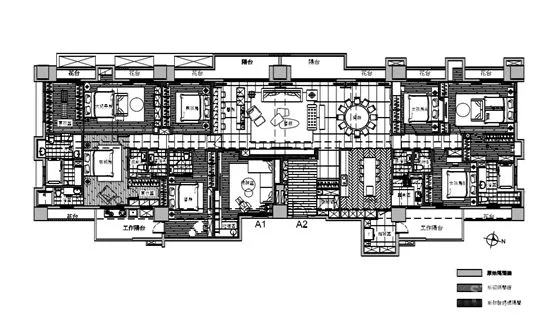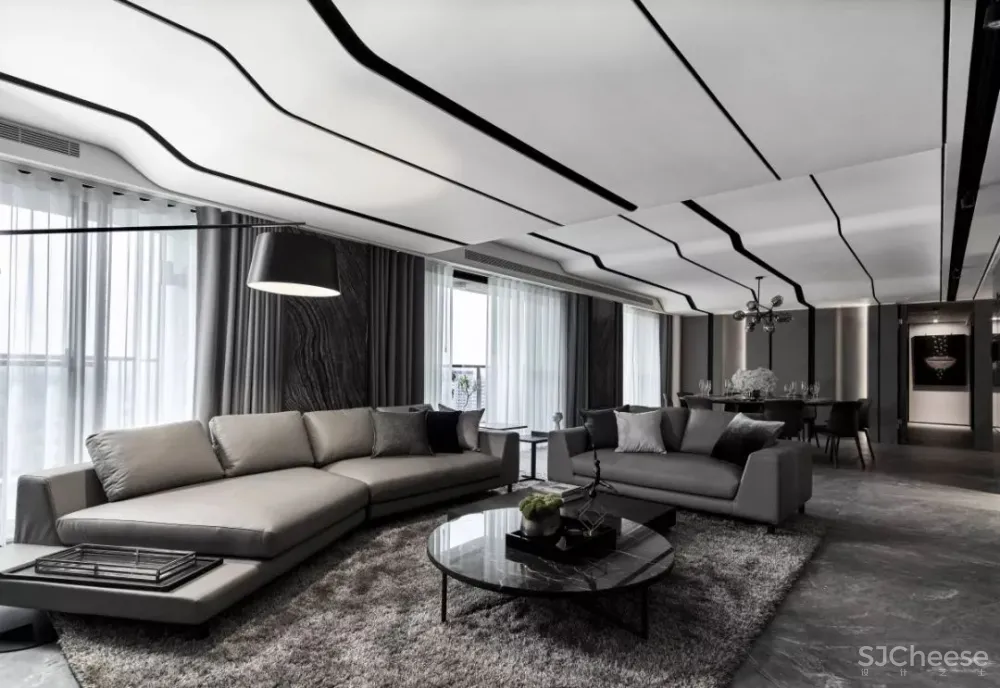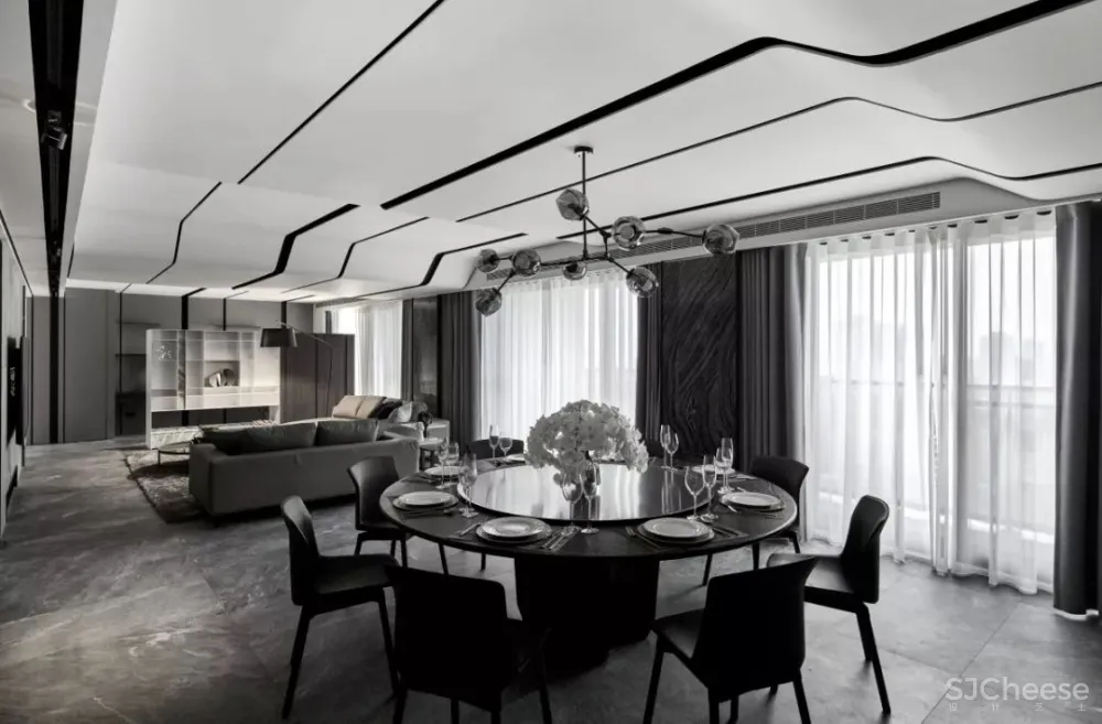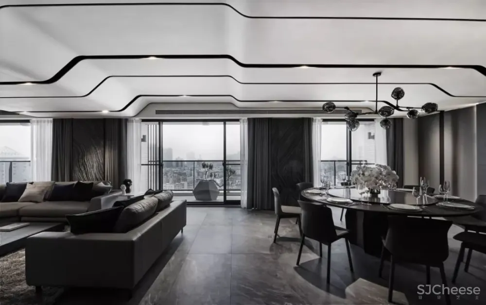 空间为两户住宅打通的居所,在横向长方的格局里,我们将七间卧房往两边横短轴的方向配置。 公共空间如:玄关、客厅、餐厅、轻食区、书房与视听室集中于屋内中央,让公私活动空间明确分野,并利用一条长纵轴贯穿全屋,作为主要行走动线。 在此轴在线,设计了波浪型天花板,一方面整合成列的大小梁,一方面呼应自然意象,让天花板的微伏曲线与户外自然光一起浮载。