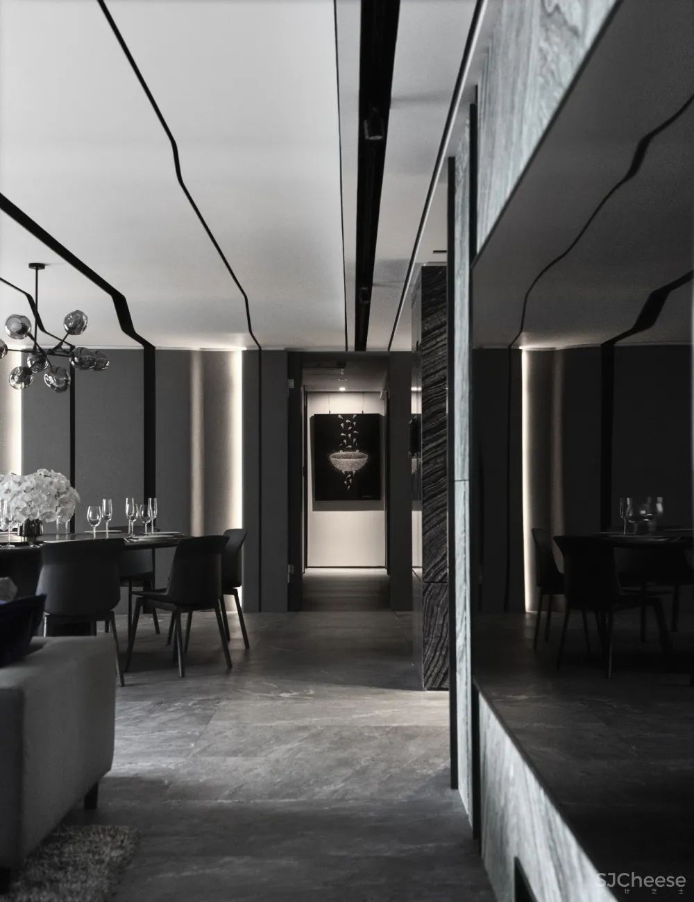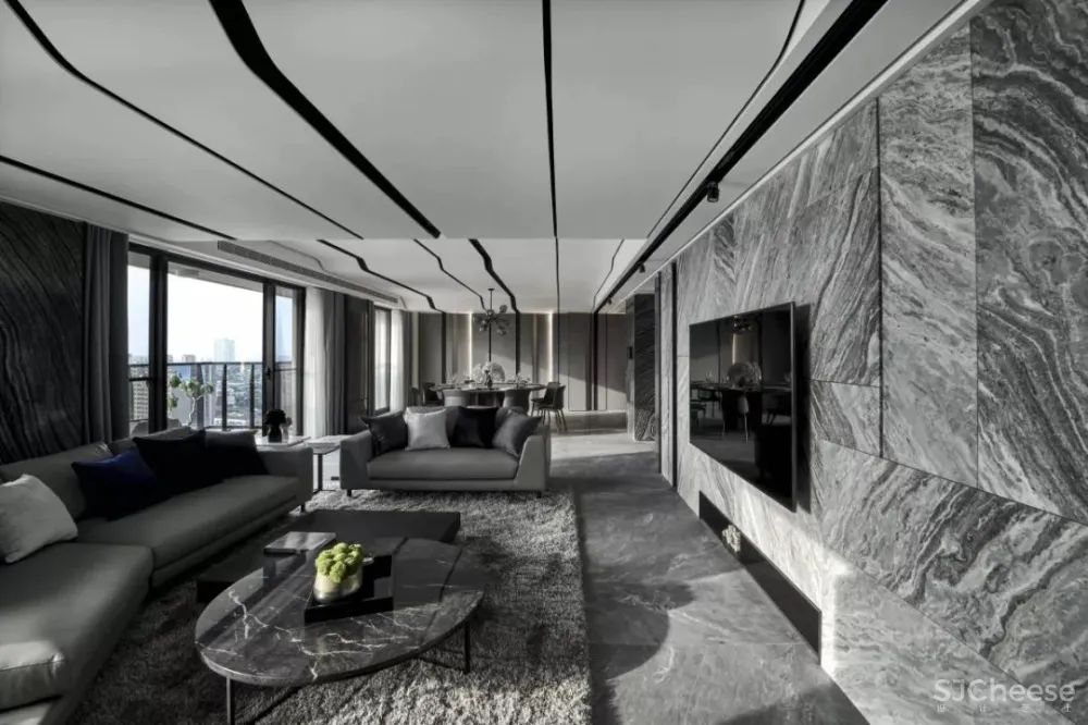 为了平衡绽放如云的顶棚漂浮感,两侧长立面以石材质感的块面收束,亦转化了水平垂直视点,开始为矩形的布阵。 客厅主墙长长的块面体延伸至玄关,以黑灰白纹路的大理石墙稳重其狭长空间,而方形不对等分割比例,为轻与重的色感对比。 精准的渐层纹路拼花,以间格0.3公分安装,直角或倒斜角有序拼接,如蒙德里安之画,立体不单调的方型组构。 特在接近玄关处,拉了一条直线,嵌灯带于内,顺势跳接至另一个短墙面,切割,以富变化,以寻求不对称中的视觉平衡感。主墙对应于临窗的石墙柱列,大开窗门间歇序列,与席地展延的黑灰石地板,需互以扶持,薄厚交替,才得以将住所凝炼出主调安静但变化度不沉寂的氛围。