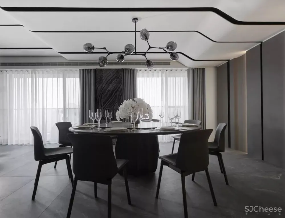亮度、微波,自四面八方展开,浮游的线条拉至端点两侧,一为书房立面,一为餐厅主墙。 餐厅墙面依着天花板线条分割,将墙与门做虚实的迭衬,并嵌以光条,以布纹饰包覆凹凸不一的面墙添赋立体感,离走道处开了一道隐藏门,以接续轻食区,亦是进入私空间的转折。