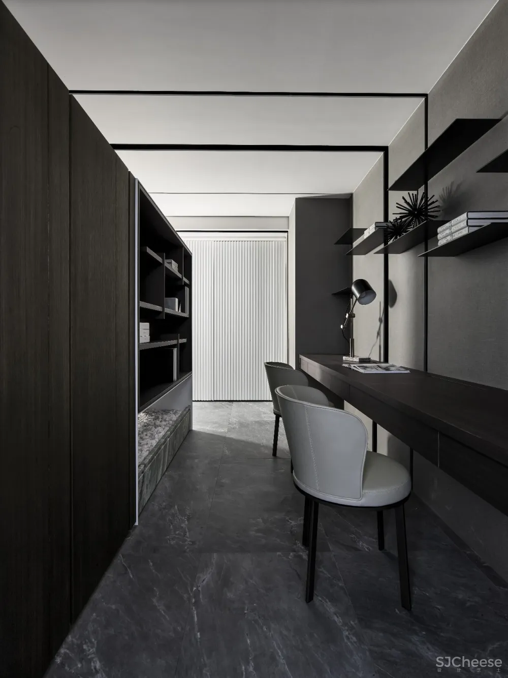 另一端景的书房墙面,承接了顶棚线条做垂直降落至底的安排,书房前端安置一白色铁件书架,其纵横切割,依着美好的比例进行,以伺光影倾注于此。 端景,作为家中视觉停驻之点,亦是引渡至其他接口的转缓,例如:进入视听室的线性隐藏门,亦以白色延续而不断接。